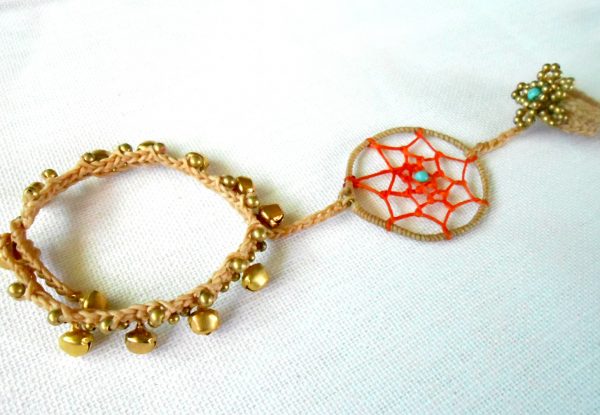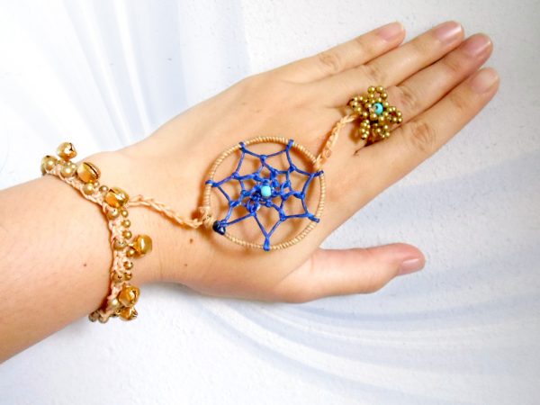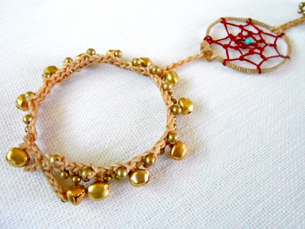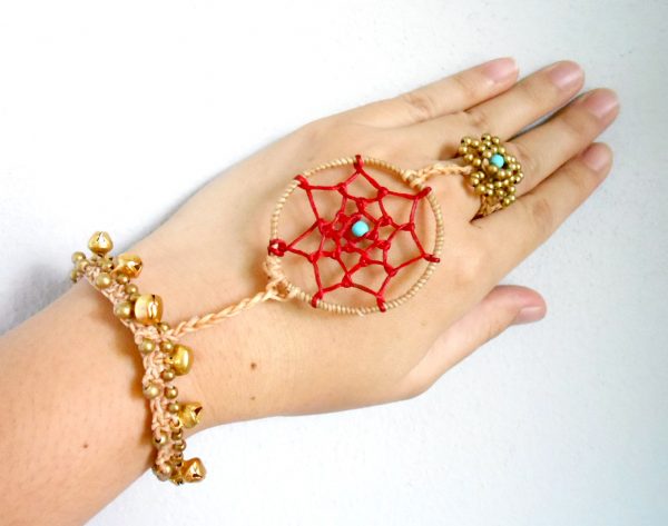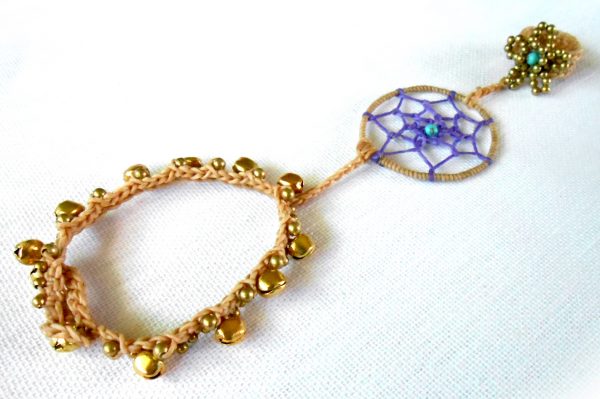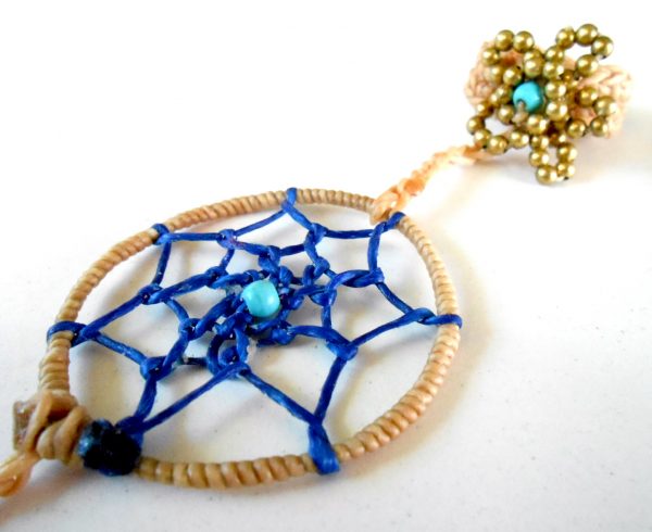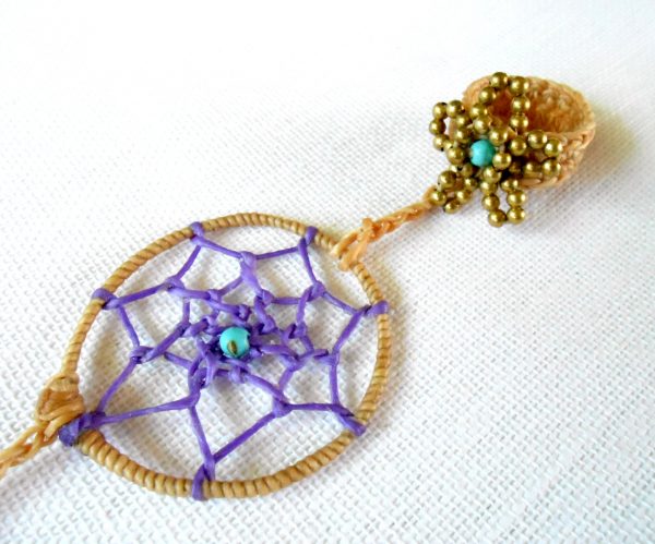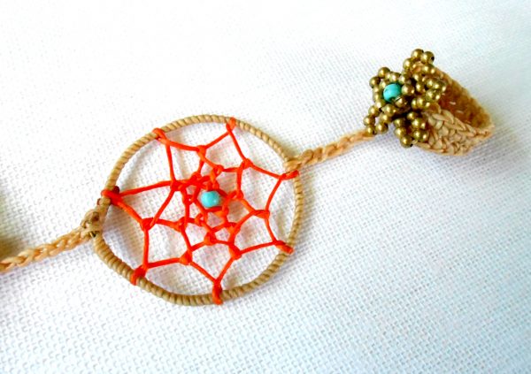 This gorgeous bohemian bracelet is one of my faves. I used waxed linen cord to wrap and weave the web of the dream-catcher and attached a beautiful long and dangling leather and rope tassel charm. Comfortable to wear. Perfect bracelet for everyday.